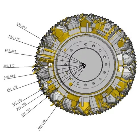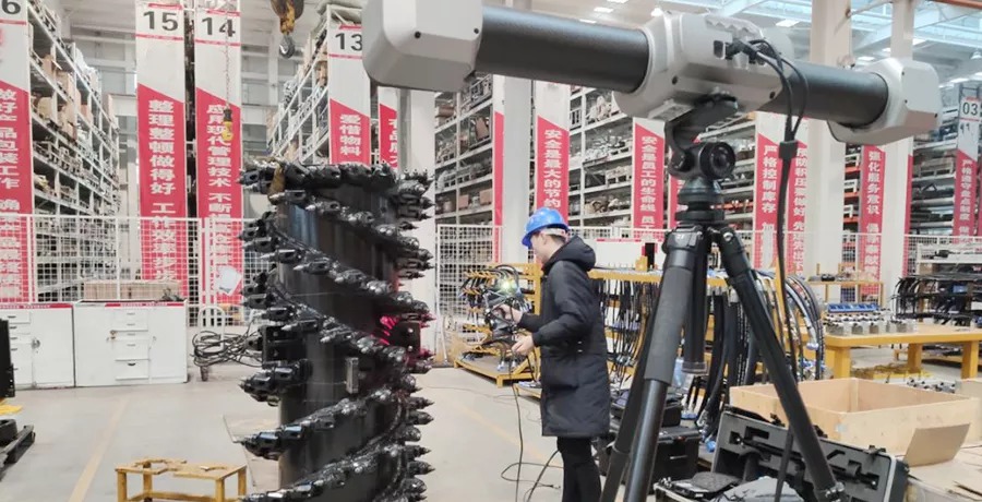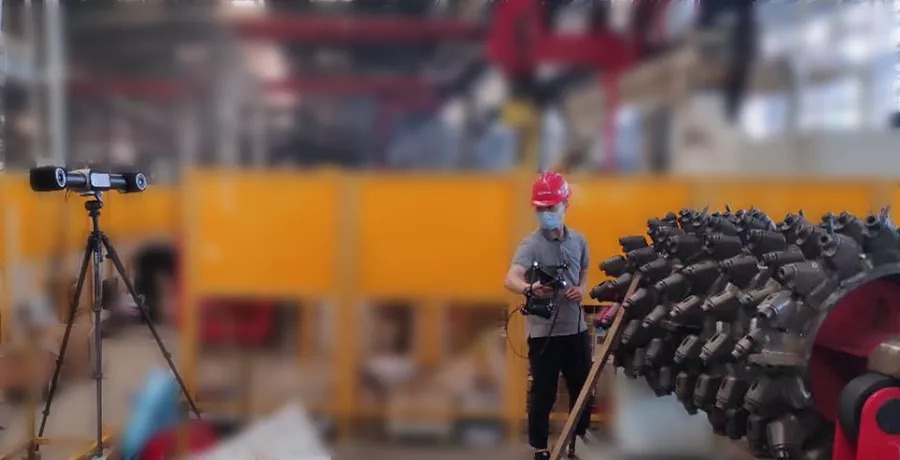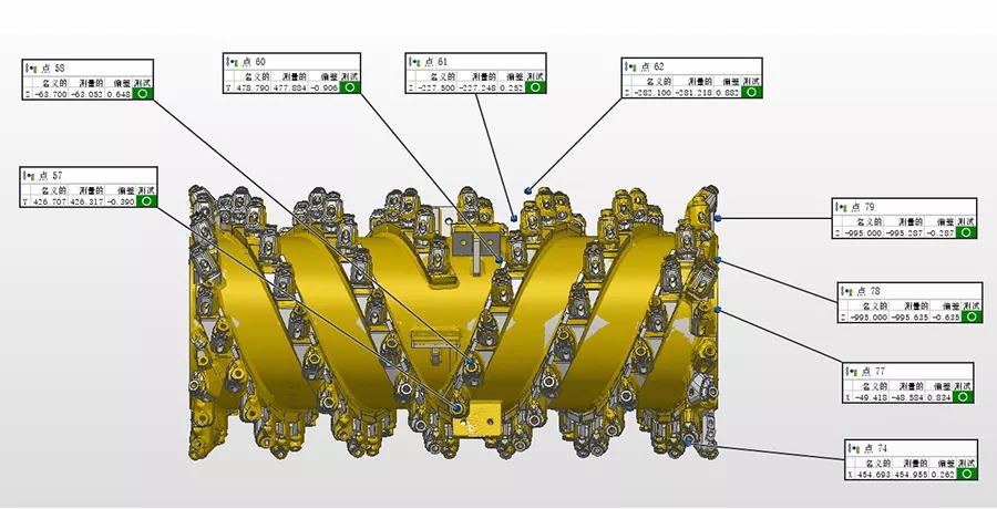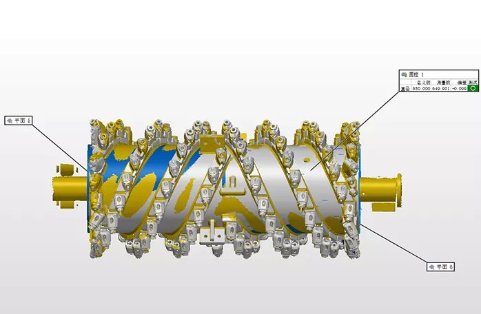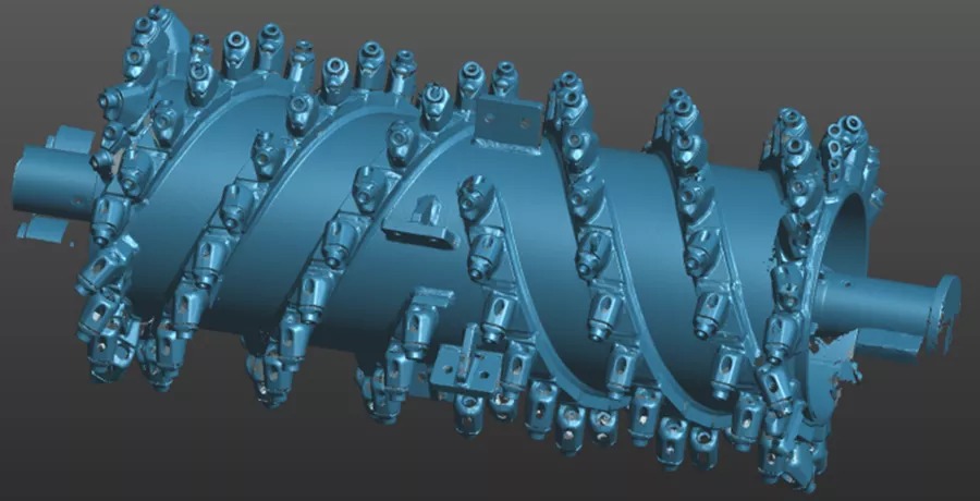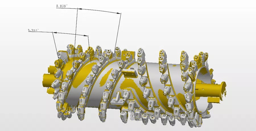 銑刨鼓是道路銑刨機(jī)的核心,需經(jīng)過嚴(yán)格的檢測,以避免磨損以及變形的負(fù)荷縮短設(shè)備使用壽命。過去采用接觸式打點(diǎn)來進(jìn)行檢測,不但測量速度慢,而且測量死角多,測量數(shù)據(jù)不全,且銑刨鼓的刀頭為活動(dòng)刀頭,裝配后測量無法測得準(zhǔn)確的刀頭點(diǎn)位。