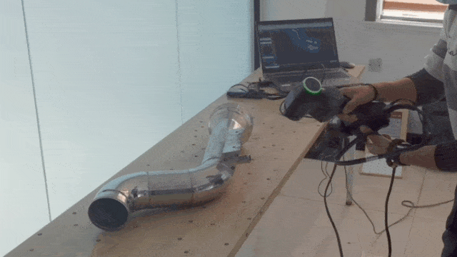 ▲將管件放在貼有標(biāo)志點(diǎn)的桌面上,使用RigelScan掃描,用時(shí)不到1分鐘,即可得到完整的管件三維數(shù)據(jù)