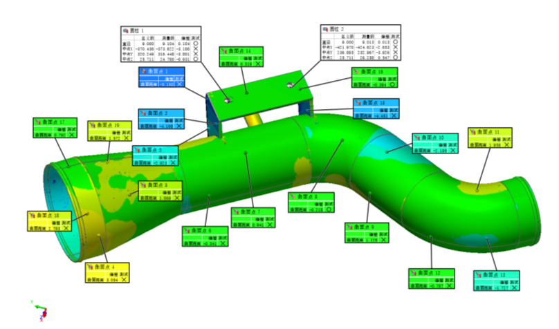使用RigelScan掃描管徑在45~150mm范圍、形狀不一的卡車(chē)排氣管/中冷氣管產(chǎn)品,結(jié)合PolyWorks軟件檢測(cè)管件產(chǎn)品的整體形變及彎曲角度、裝配面、斷面圓心偏差等。