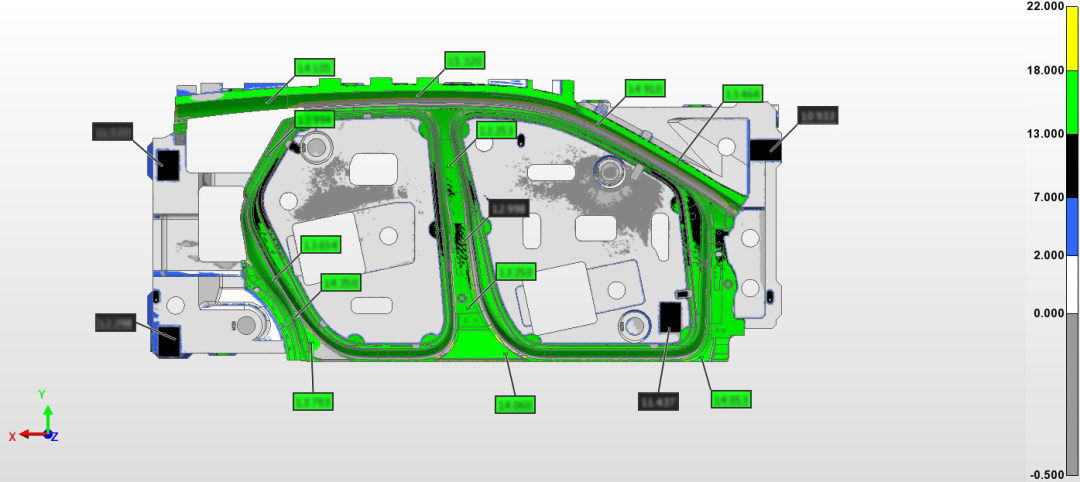▲將三維檢測數(shù)據(jù)與原數(shù)模進行比對,得到各位置的加工余量。汽車側門模具加工余量色彩差圖(檢測報告部分示意)